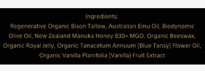 Ancestral Blue Balm was created to calm, rebalance, and restore sensitive, reactive skin. Made with prairie grass-fed and finished, Regenerative Organic Certified, humane field-harvested, never vaccinated wild bison tallow and infused with soothing blue tansy and nutrient-rich botanicals, this balm helps reduce visible redness and calm inflammation. It supports barrier repair and improves the appearance of eye bags—revealing smoother, more even, resilient skin.